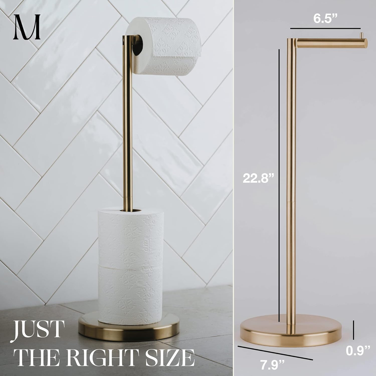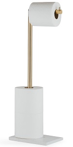 Get our easy to use brushed gold freestanding toilet paper holder for that easy to load, durable and innovative storage solution for your toilet paper rolls. This toilet paper stand is a simple yet effective solution to store and organize your toilet tissue rolls.