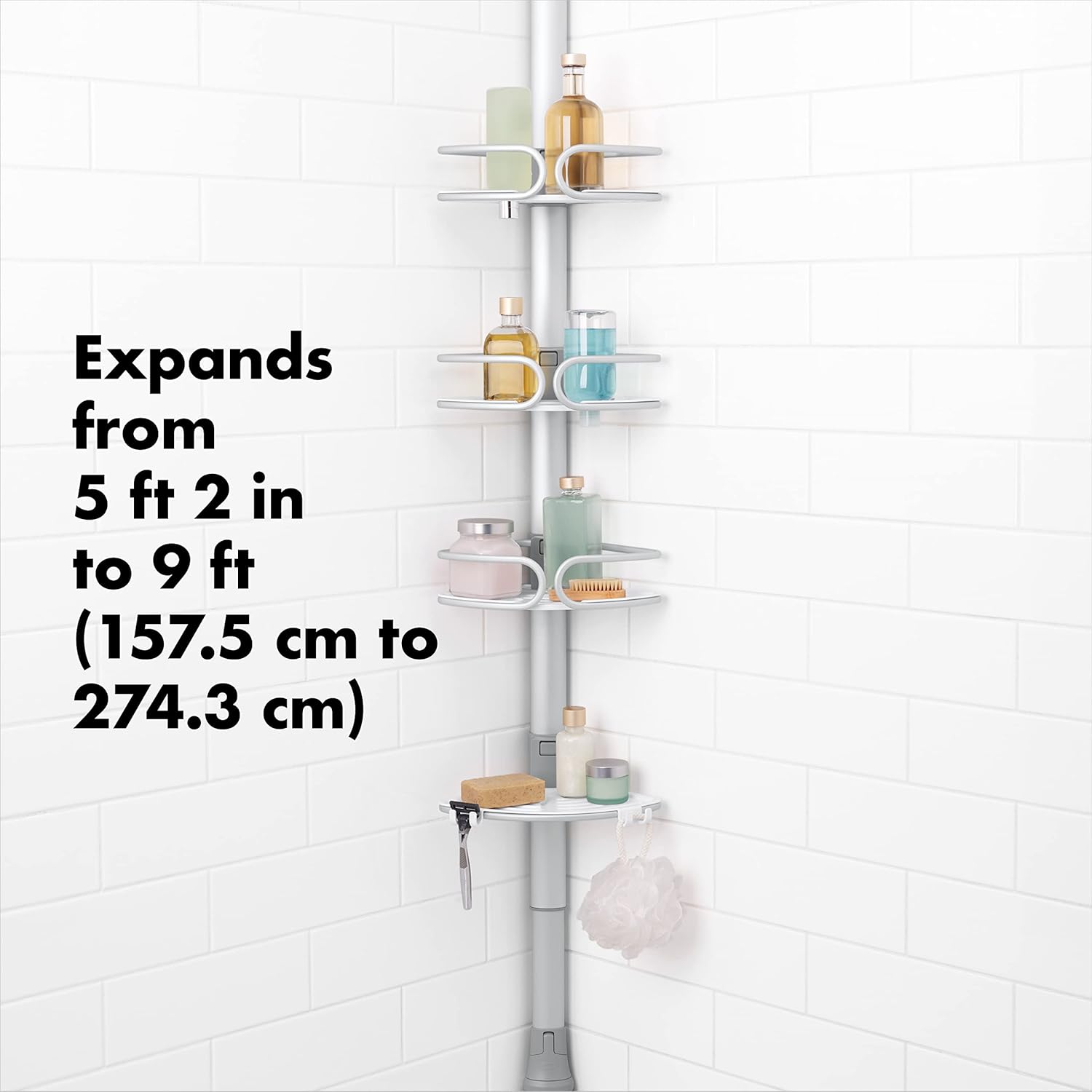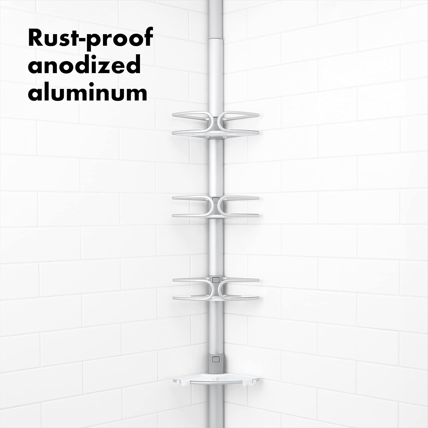 Take bathroom organization to the next level the OXO Good Grips Quick-Extend Aluminum Pole Caddy. Our Caddy’s easy-to-install, double-extend design and sleek, rust-proof anodized aluminum construction solve any shower storage shortage—and look good doing it. The Caddy extends in both directions with a pull—from 5 ft 2 in to 9 ft (157.5 cm to 274.3 cm)—and locks securely into place to fit neatly into shower stalls and bathtubs. Four sturdy, adjustable shelves provide plenty of storage for shower essentials, including deluxe-sized bottles. The soap shelf has raised ridges and drainage slots for quick drying, while the other shelves have holes for storing shampoo, body wash and conditioner bottles upside down. Our Caddy includes hooks for razors, washcloths or loofahs, plus removable trays for thorough cleaning. No wonder it was named one of Time magazine’s Best Inventions 2019.
