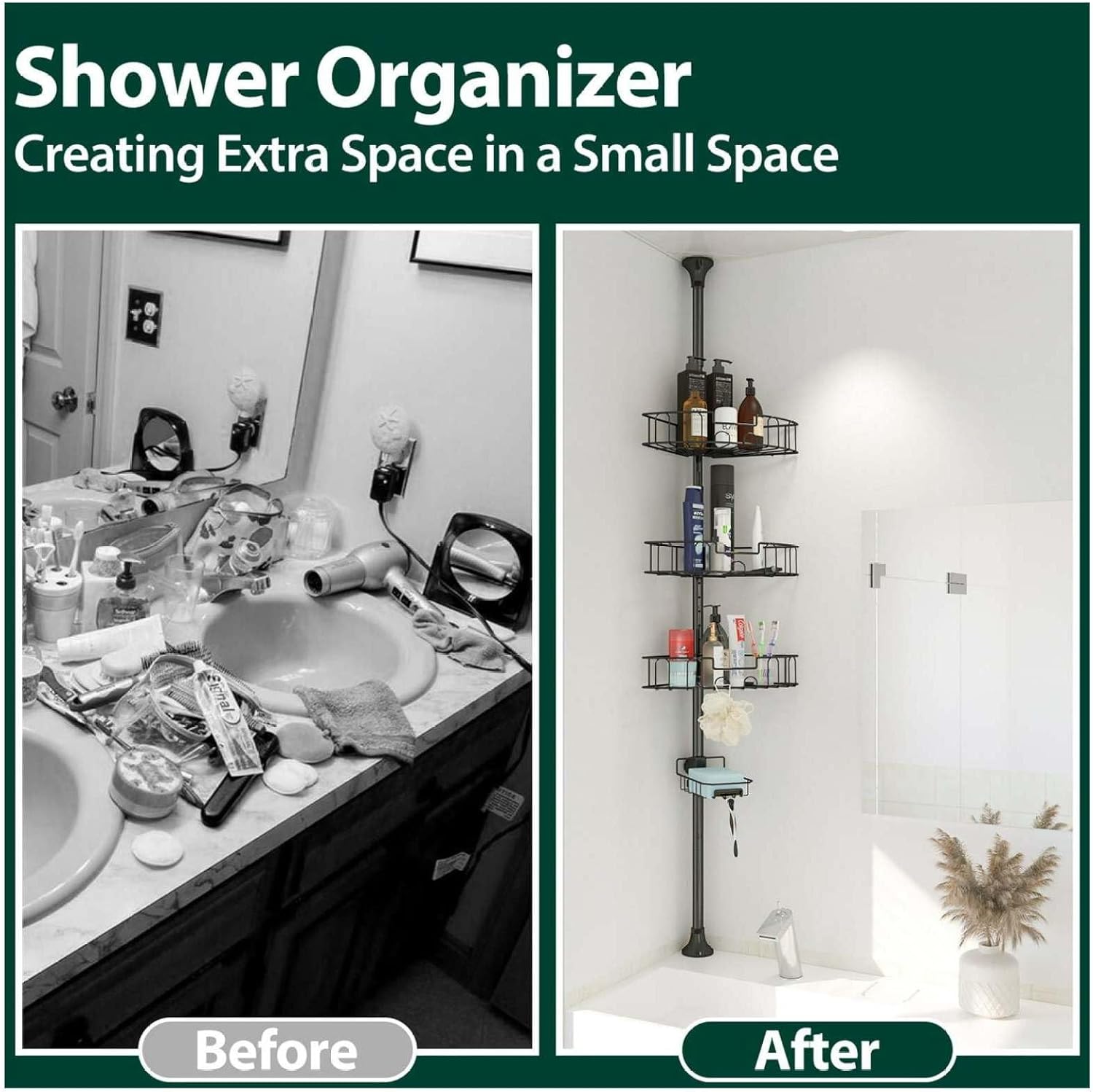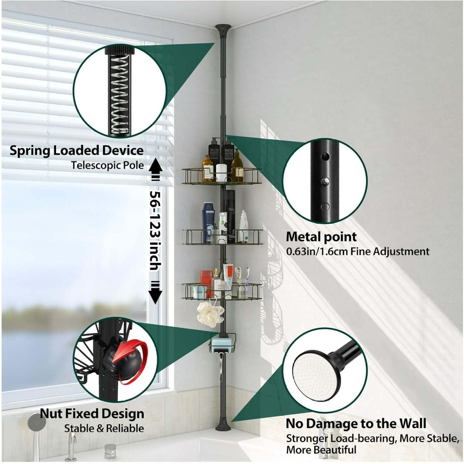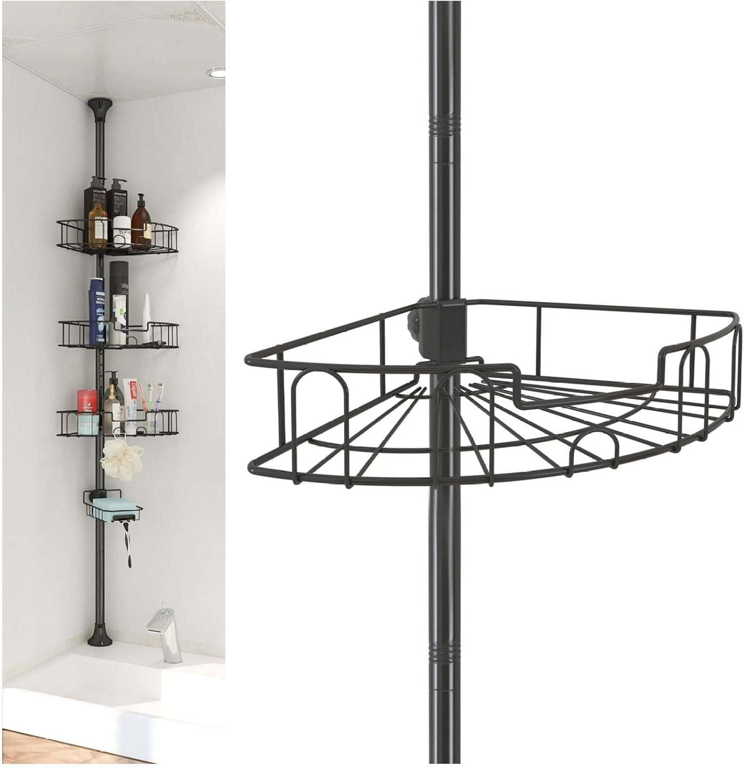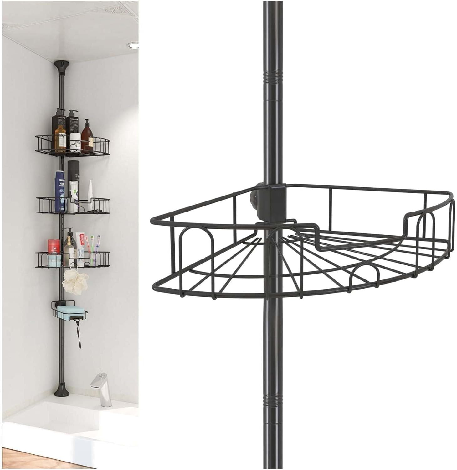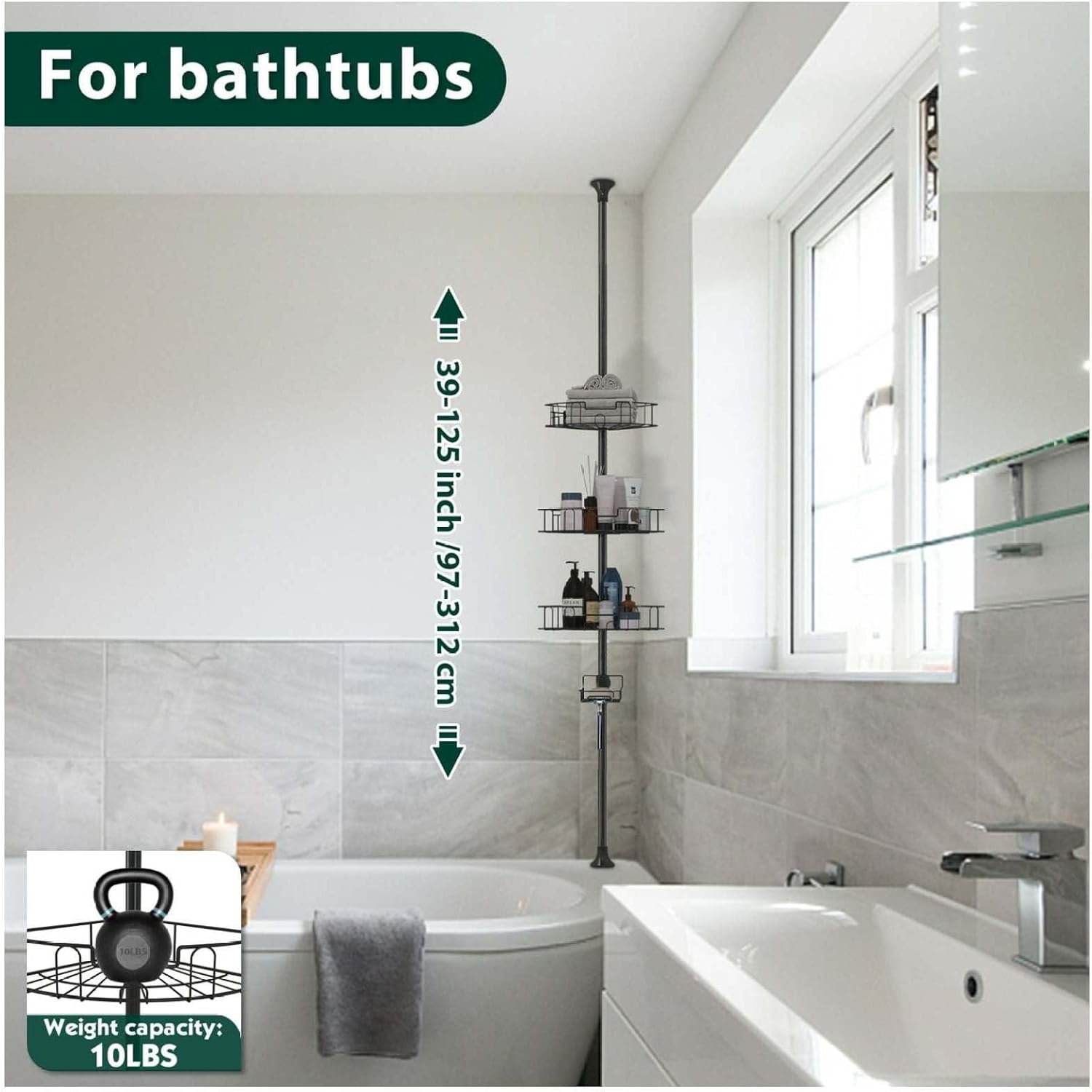 Maximize your bathroom space with this durable rustproof shower caddy; designed with a tension pole system, it fits ceilings between 4.5ft to 10.8ft, offering versatile placement options without requiring drilling or tools; constructed entirely of stainless steel, this caddy resists rust and corrosion, ensuring long-lasting use even in humid environments; featuring four adjustable stainless steel baskets, this organizer provides ample storage for shampoos, conditioners, body washes, and other bath essentials, each shelf capable of holding up to 12lbs; the open grid design promotes quick water drainage, preventing water buildup and simplifying cleaning; the sprung-loaded top allows for easy adjustment between floor and ceiling, while the sturdy tension pole ensures stability and prevents wobbling; this shower caddy is backed by a 24-month warranty, offering replacement or refund for peace of mind; simple assembly and a sleek black finish make it a perfect addition to any bathroom; measure your intended space before installation to ensure proper fit; overall dimensions accommodate a height range of 39 to 125 inches, providing flexibility for various bathroom layouts; enjoy a tidy and organized shower experience with this practical and stylish storage solution; the robust construction and thoughtful design make it ideal for families and anyone seeking efficient bathroom organization.