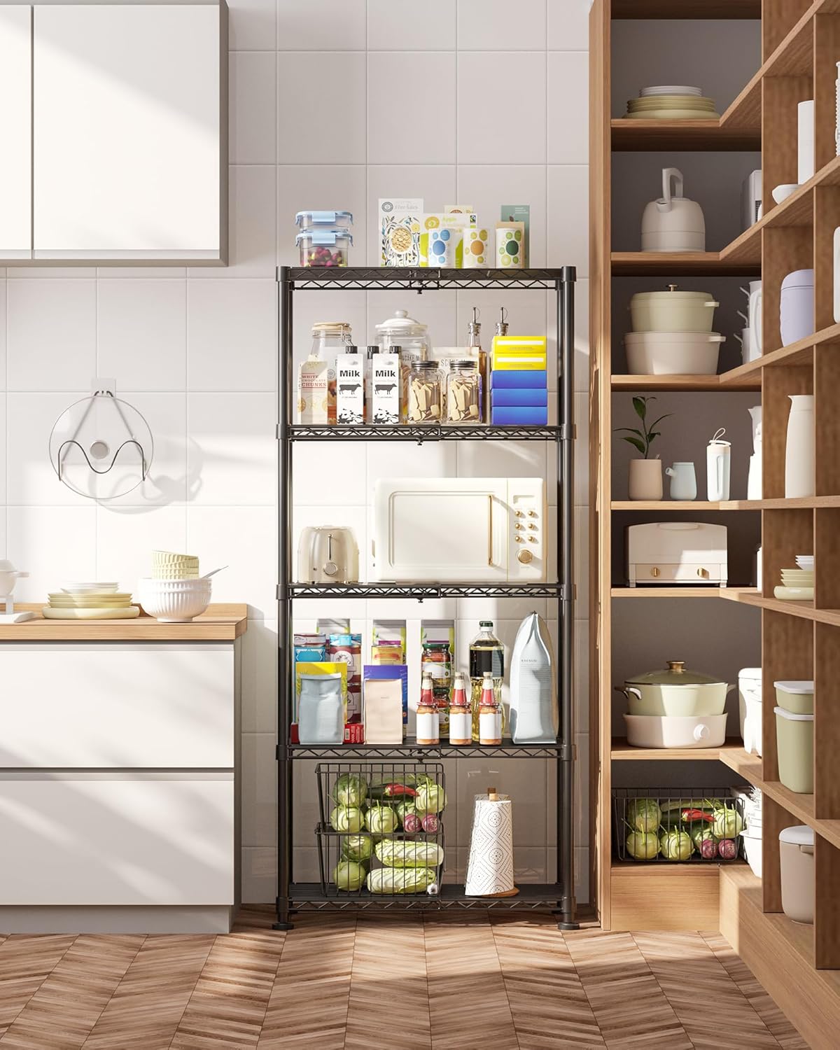 Storage Shelves - 5-Tier Width Expandable Shelf Organizer with Leveling Feet, Rust-Proof & Waterproof Wire Shelving Unit for Bedroom, Bathroom, Garage, 16.4"-27"×11.8"×60", Black