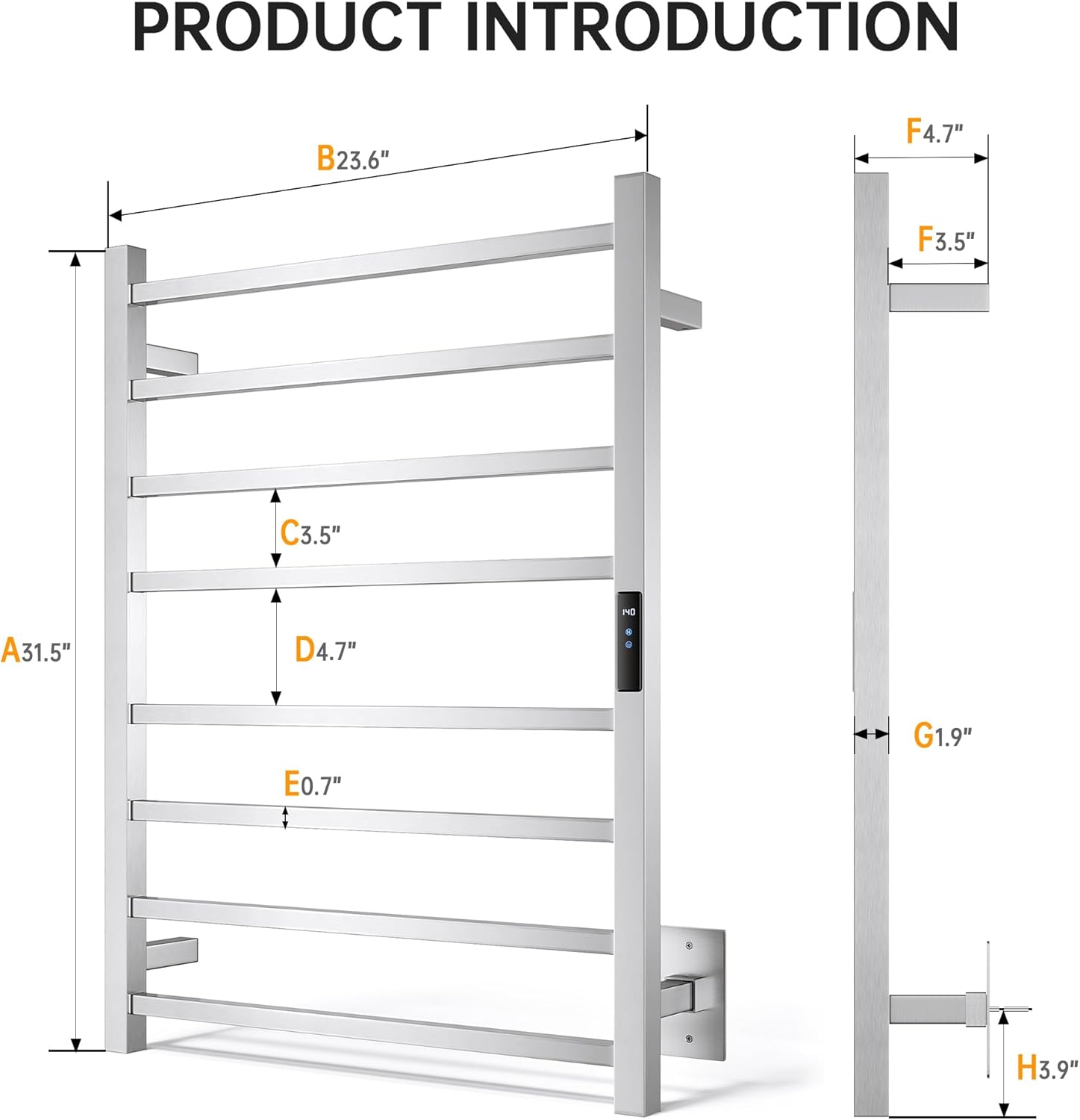 Towel Warmer Rack, Heated Towel Racks for Bathroom, Wall Mounted Towel Warmer, Stainless Steel 8-Bars Drying Rack with Intelligent Touch Screen Timer, Brushed Nickel